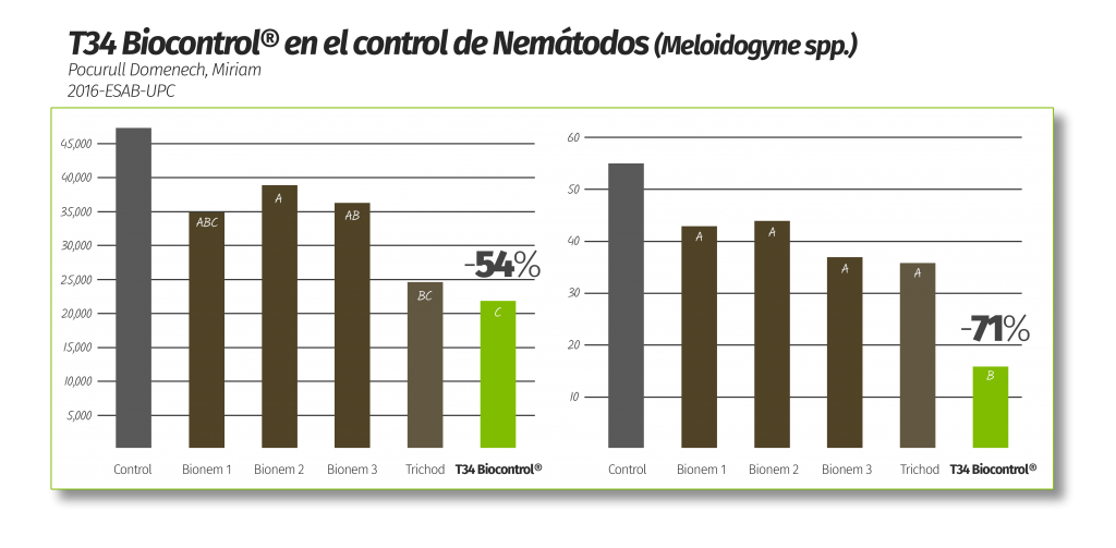 T34 es un producto eficaz para el control de enfermedades fúngicas, es un organismo que actúa con diversos mecanismos de acción frente a un amplio rango de patógenos y tiene la capacidad de activar los mecanismos de resistencia de las plantas, no sólo frente a enfernedades fúngicas del suelo y también foliares, en este estudio se demuestra la efectividad de T34 Biocontrol en el control de nematodos como Meloidogyne incognita.