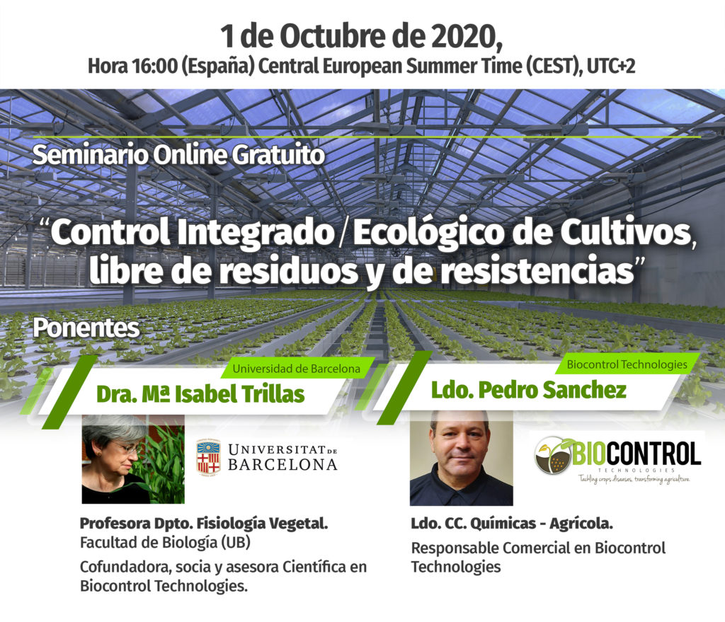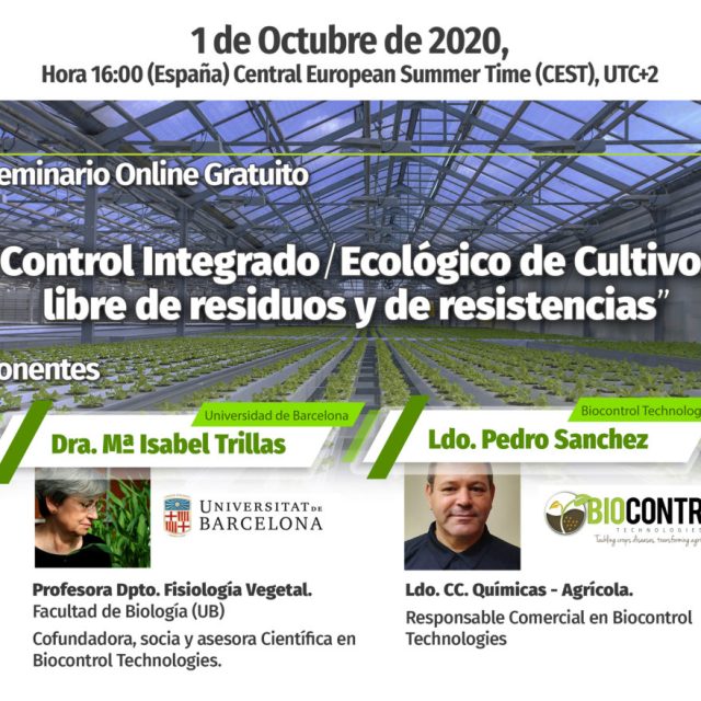 El pasado jueves 1 de Octubre realizamos el primer seminario en línea titulado “Control Integrado / Ecológico de cultivos, libre de residuos y de resistencias”, impartido por la Dra. Trillas, profesora del departamento de Fisiología Vegetal de la Facultad de Biología en la Universidad de Barcelona, co-fundadora, socia y asesora científica de Biocontrol Technologies, así como también por el responsable comercial de Biocontrol Technologies, José Pedro Sánchez, licenciado en ciencias Químicas – Agrícolas por la Universidad de Almería.