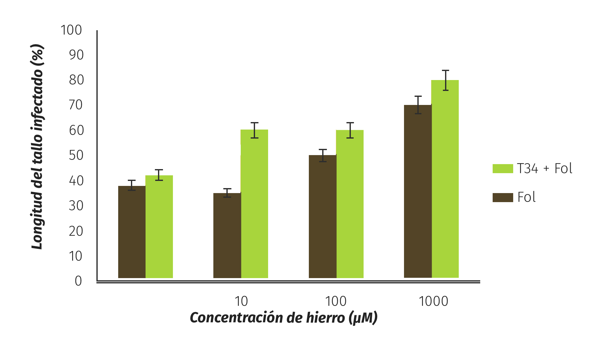 Como se muestra en la Figura 1, la longitud del tallo infectada por Fusarium fue menor cuando el sustrato fue tratado con T34, pero solamente a la concentración de 10 μM. A mayor y menor concentración el efecto de T34 sobre la severidad de la fusariosis no fue significativo.