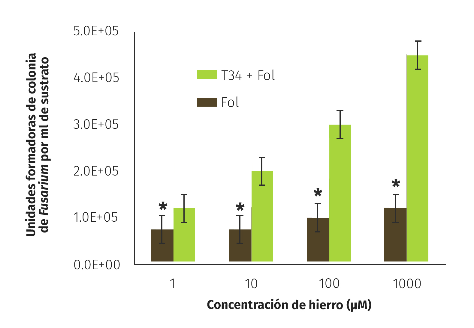 La producción de sideróforos por parte de Trichoderma es superior a la de Fusarium y es inhibida por altas concentraciones de hierro en el medio (1 y 2). En este sentido, parece que a la concentración de 10 μM (que sería la más adecuada para el cultivo de plantas), T34 compite por el hierro más eficientemente que Fusarium. La hipótesis es que a mayor concentración de hierro (100 y 1000 μM) se inhibe la producción de sideróforos por parte de T34 y por lo tanto decae la competición por hierro entre agente de control y patógeno. A la concentración de 1 μM, T34 no redujo la severidad de la fusariosis de forma significativa y esto se puede atribuir al bajo nivel de severidad que se produjo a esta concentración. A 1 μM de hierro, la baja disponibilidad de hierro podría explicar la poca actividad de ambos microorganismos