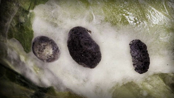 Este micelio produce agregados de las hifas que producen una substancia oscura (melanina) con los que se originan unos cuerpos fructíferos irregulares, negros que se conocen como esclerocios.
