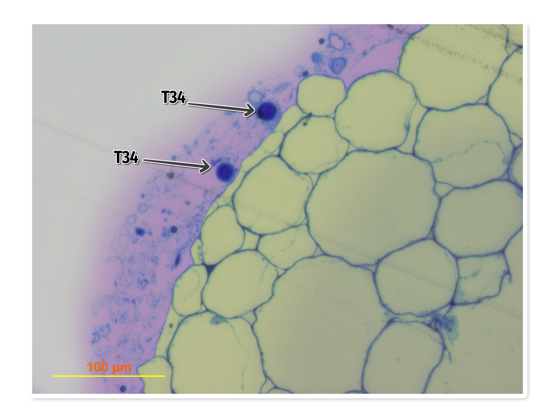 Observación al Microscopio Electrónico de Transmisión de las células epidérmicas (coloreadas en lila/violeta claro) de la planta Cucumber sativus tratada con T34 (107 ufc/ml).