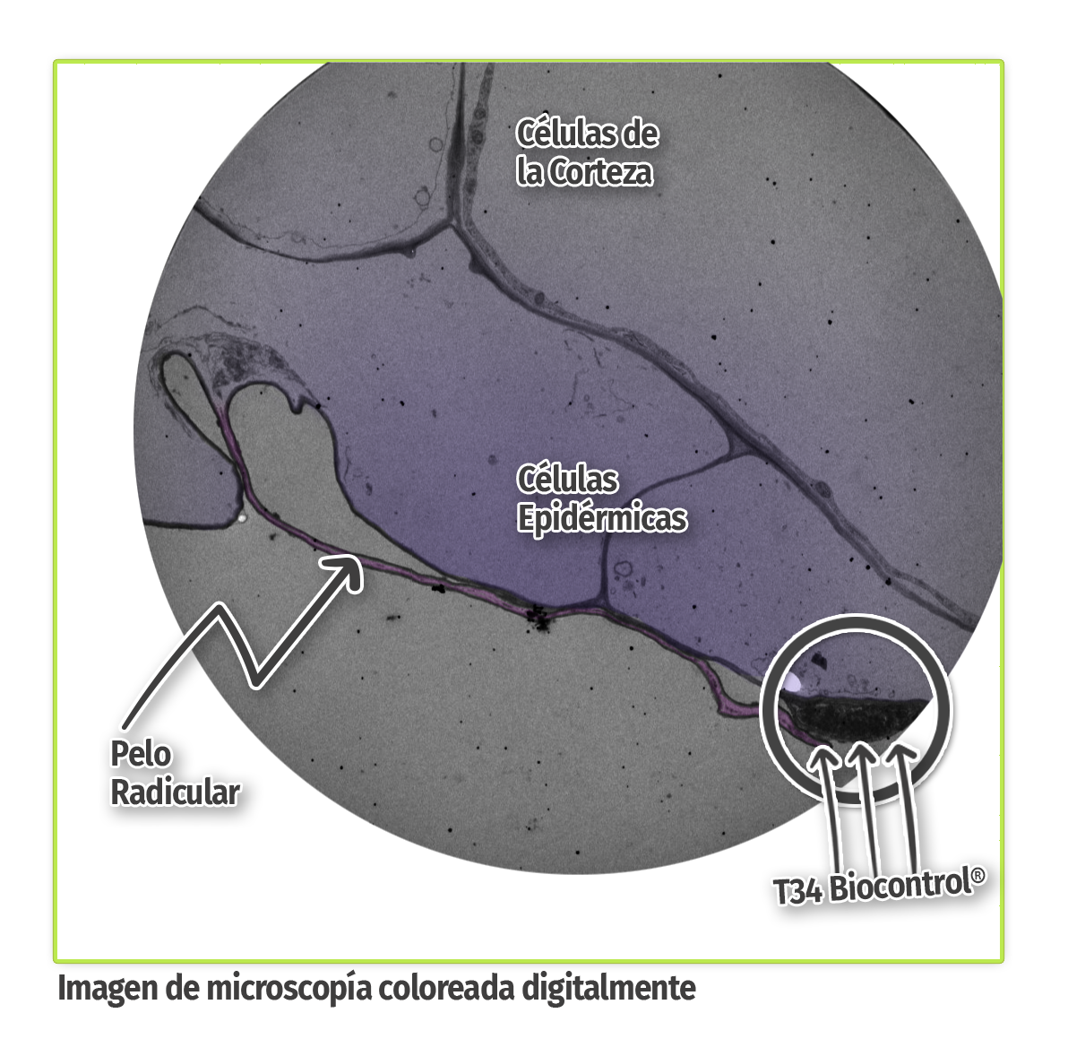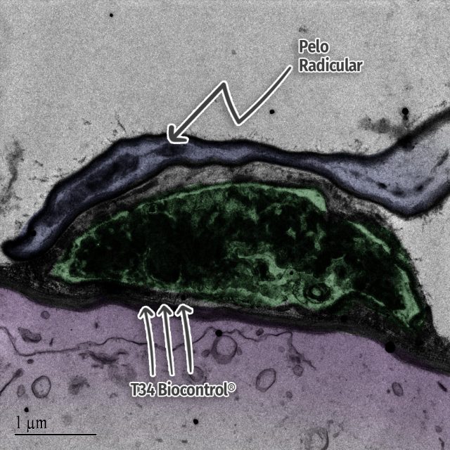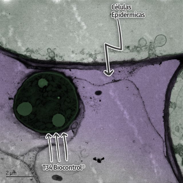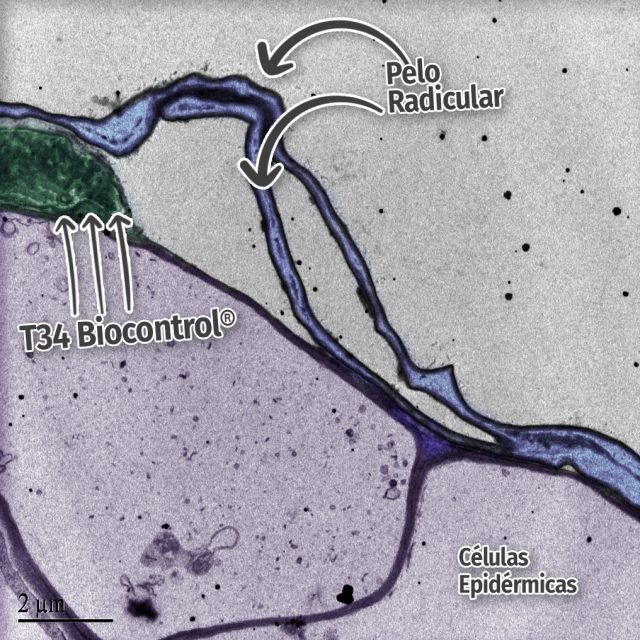 En este caso vemos además del agente de control biológico, T34 (coloración oscura, señalada en la imagen) y cómo los pelos radiculares de las células epidérmicas se van aproximando. *La imagen ha sido coloreada digitalmente, para facilitar su interpretación.