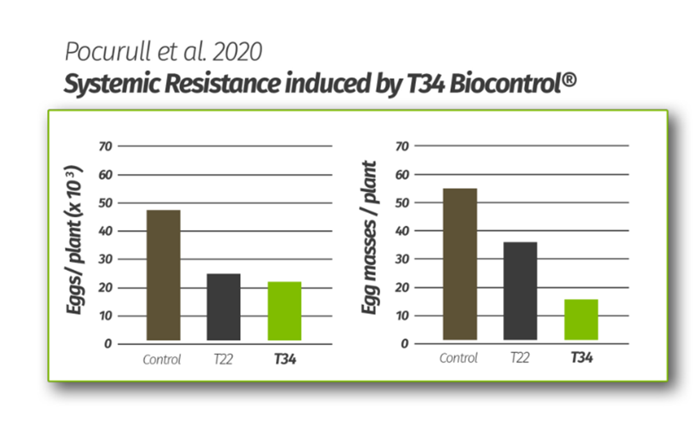 Los resultados del estudio de Pocurull et al. 2020 indican, como se observa en la gráfica adjunta, que Trichoderma asperellum, cepa T34 tiene un efecto sobre las plantas induciendo los mecanismos de resistencia sistémica propios, así las plantas de tomate afectadas por M. incognita en con una reducción del 71% en las masas de huevos y una reducción del 54% en la cantidad de huevos por planta.