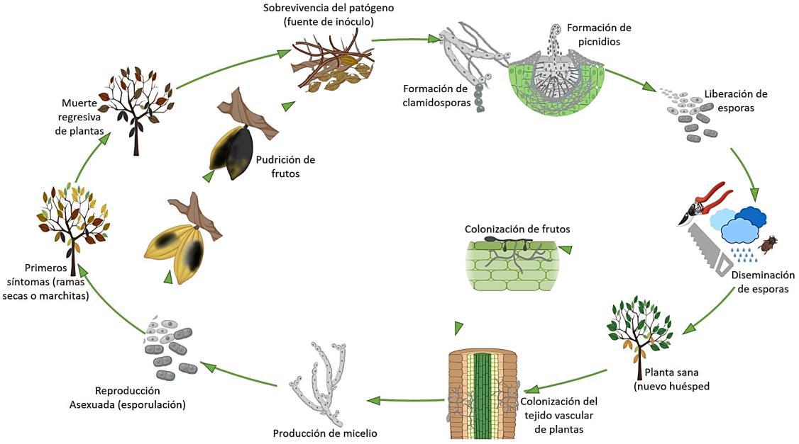 El microorganismo en el suelo podría permanecer como saprófito en las hojas, frutos infectados y fragmentos de ramas caidas y también como clamidosporas. Las esporas contenidas en los picnidios son liberadas al ambiente en condiciones óptimas (mínima 15ºC y optima 28ºC, máxima a 40ºC), siendo diseminadas por el viento, la lluvia (7) o transportadas a través de herramientas e insectos de la familia Miridae (Helopeltis thetvora, H. ammonli y H. theobromae) (8, 9, Figura 1).