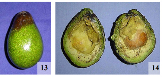 (14) Al cortar el fruto afectado se observa la pudrición del mesocarpo que se inicia en la zona de inserción y avanza a todo el fruto.