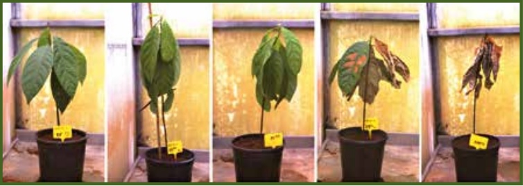 Una vez que el hongo llega a la planta, pueden observarse lesiones en frutos (Kranz et al., 1977), brotes y ramillas jóvenes (10), causando graves daños en el rendimiento de mazorcas especialmente en variedades de cacao susceptibles (11, Figura 1).