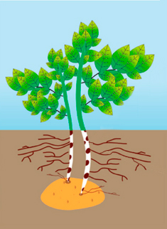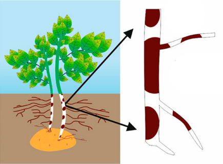 La infección en patata comienza a partir de suelos contaminados o de tubérculos de semilla infectados. R. solani puede sobrevivir en el suelo como micelio o en forma de esclerocios (estructuras de resistencia que pueden estar años latentes). Al plantar patatas infectadas o en suelos infectados, el hongo se desplaza desde el inóculo hasta el brote en crecimiento, infectando el tallo subterráneo.