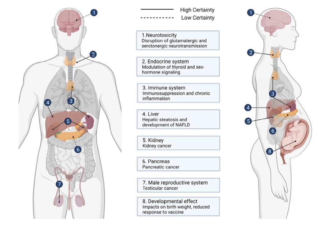 Entre los efectos con mayor evidencia destacan la neurotoxicidad (alteración de la neurotransmisión), la disrupción endocrina (afectando al eje tiroideo y hormonal sexual), y la inmunotoxicidad (inmunosupresión e inflamación crónica).