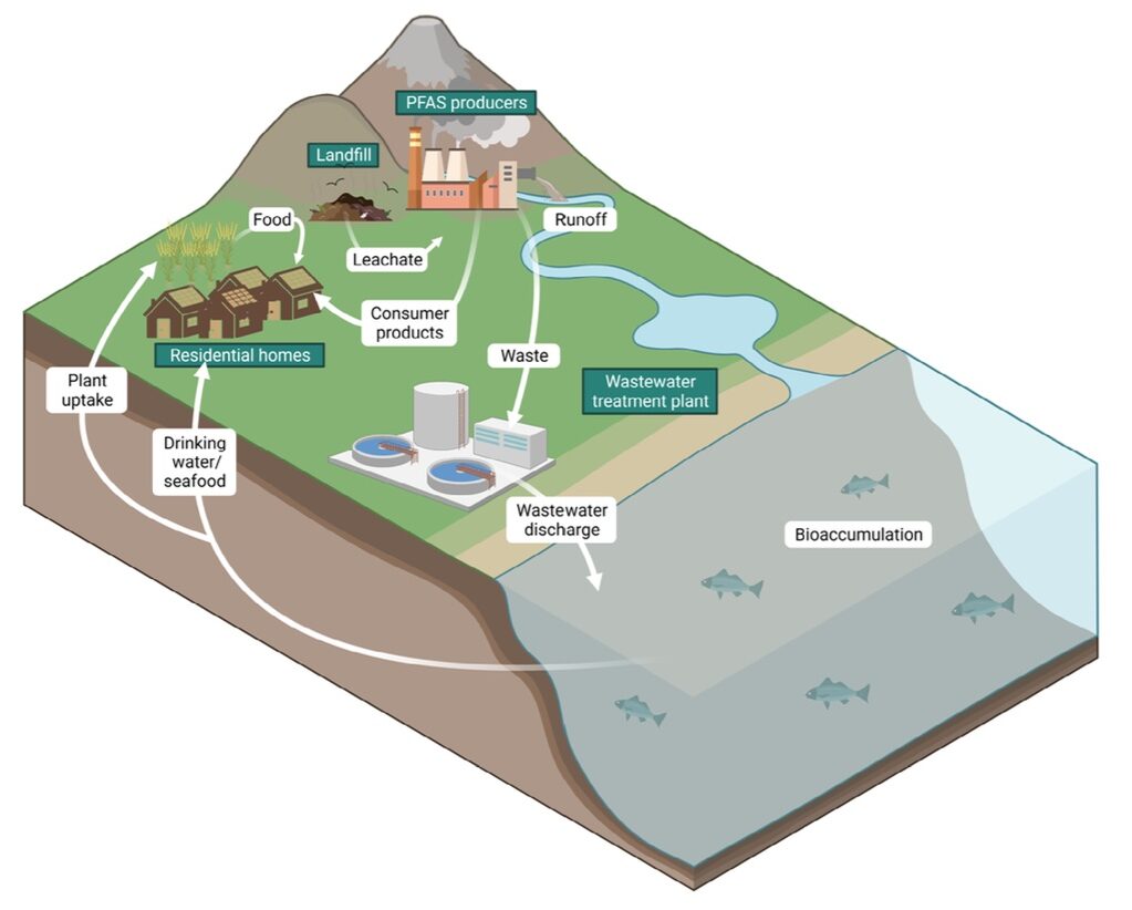 Figura 2: Esquema que representa el destino ambiental de los PFAs. Disponible en: https://www.openaccessgovernment.org/ebook/pfas-forever-chemicals-perfluoroalkyl-toxicology/155899/