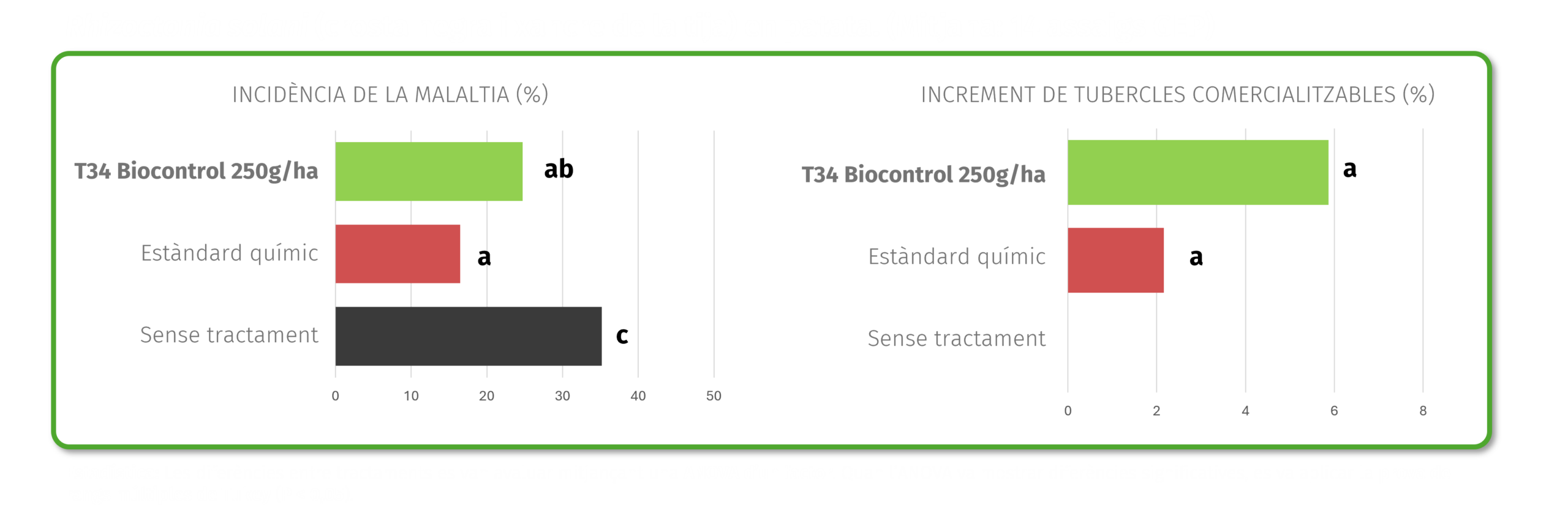 Els resultats obtinguts en assaigs de camp mostren que aquesta estratègia permet assolir nivells d’eficàcia comparables als fungicides químics de referència , especialment en el control de malalties del sòl com ara Rhizoctonia solani .