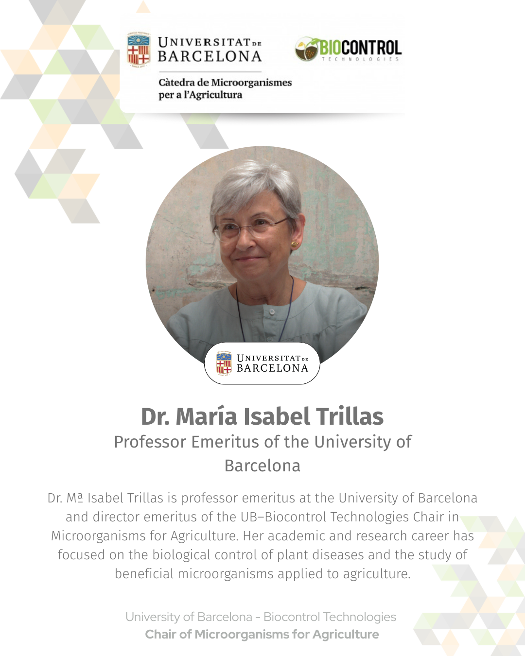 This session will feature Dr. Mª Isabel Trillas, Emeritus Professor at the University of Barcelona and Emeritus Director of the UB–Biocontrol Technologies Chair in Microorganisms for Agriculture, who will share her experience and expertise on the use of beneficial microorganisms as a tool for disease control in crops.