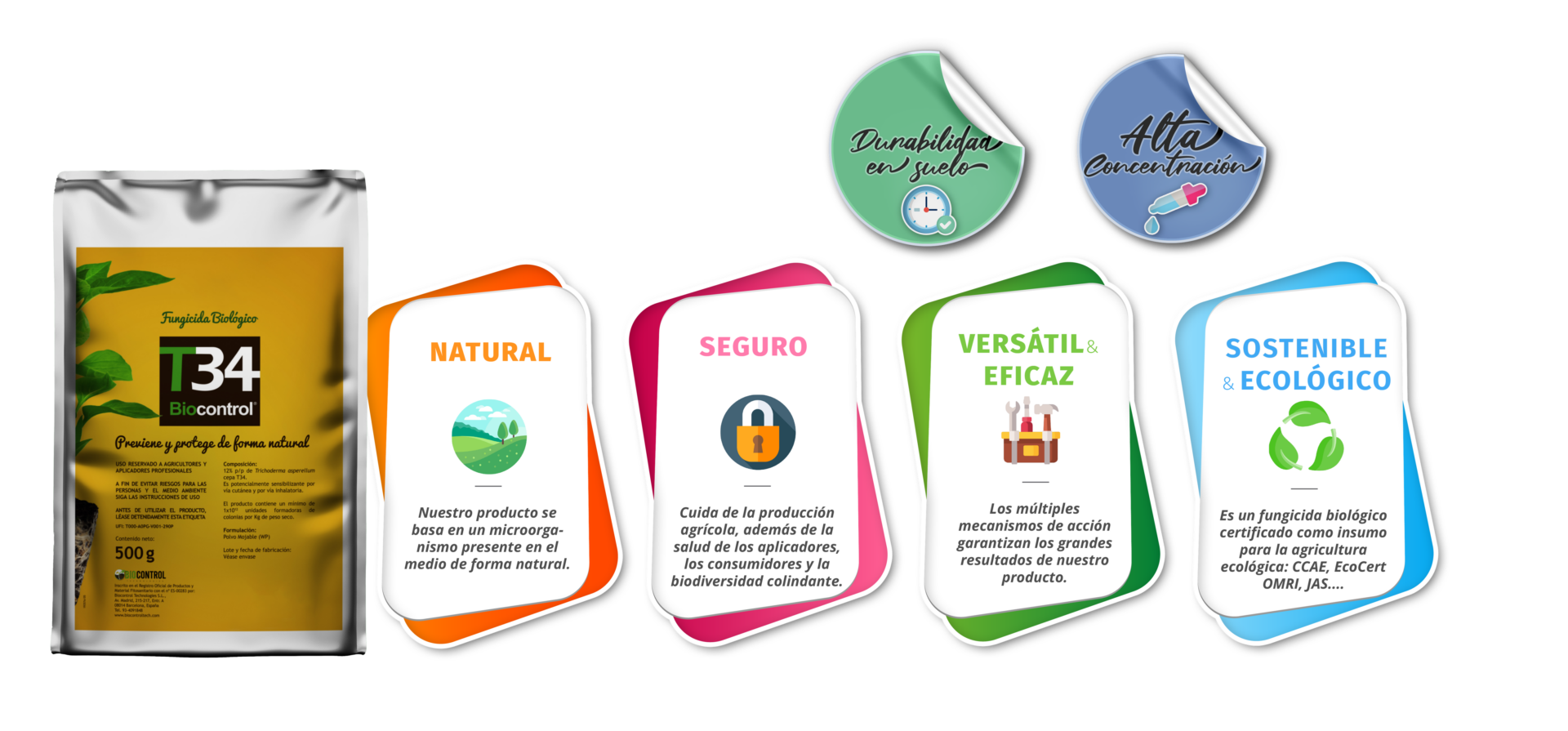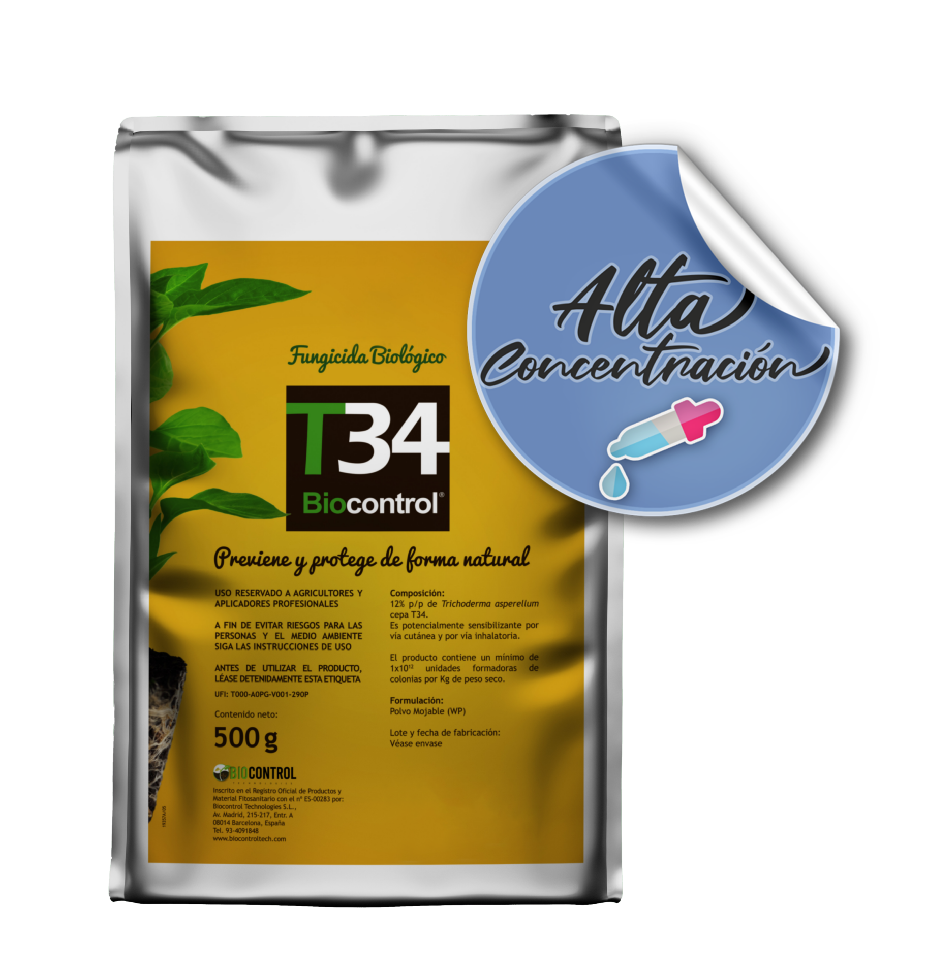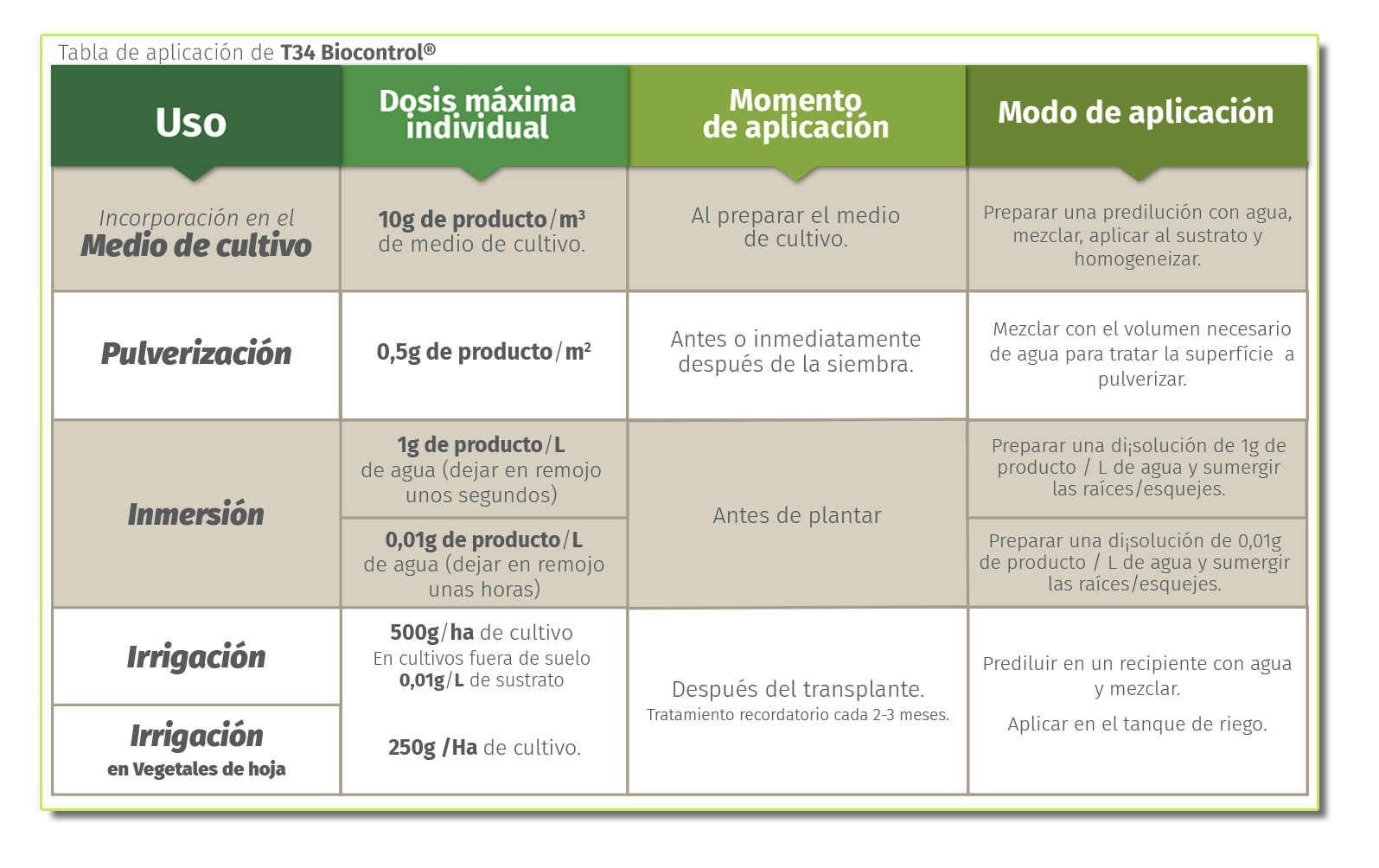 Asimismo, recomendamos probar primero la compatibilidad con la fórmula WP (polvo humectable) de T34 Biocontrol®.