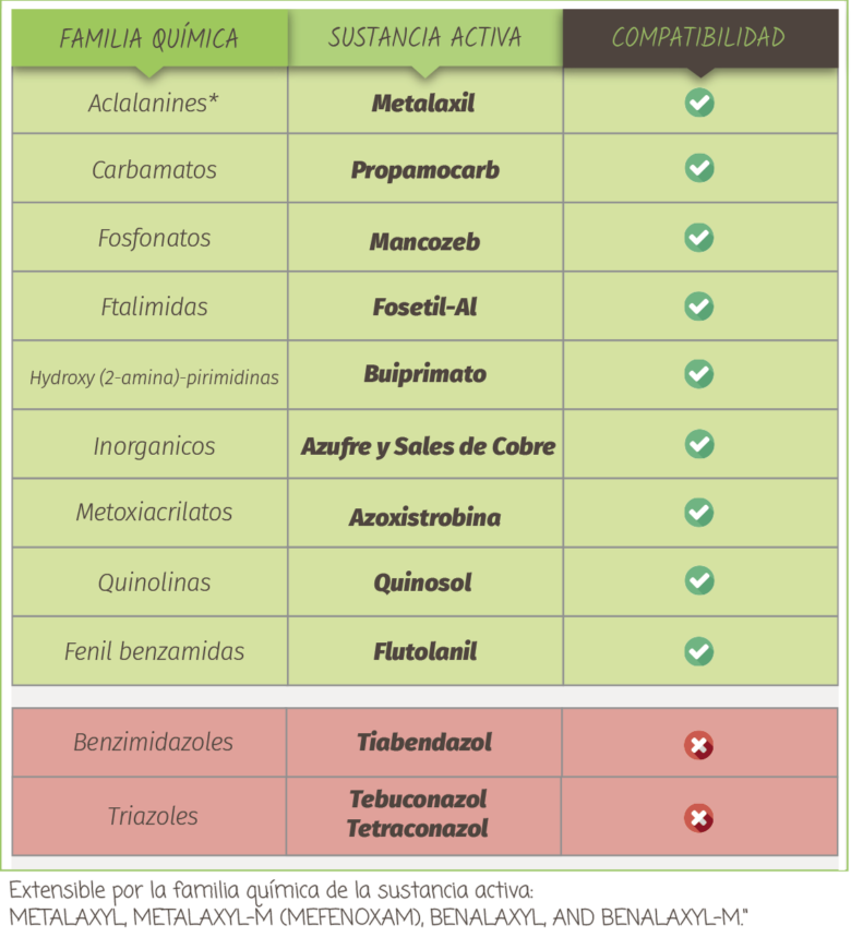T34 Biocontrol® es compatible con la mayoria de extractos vegetales utilizados en agricultura.